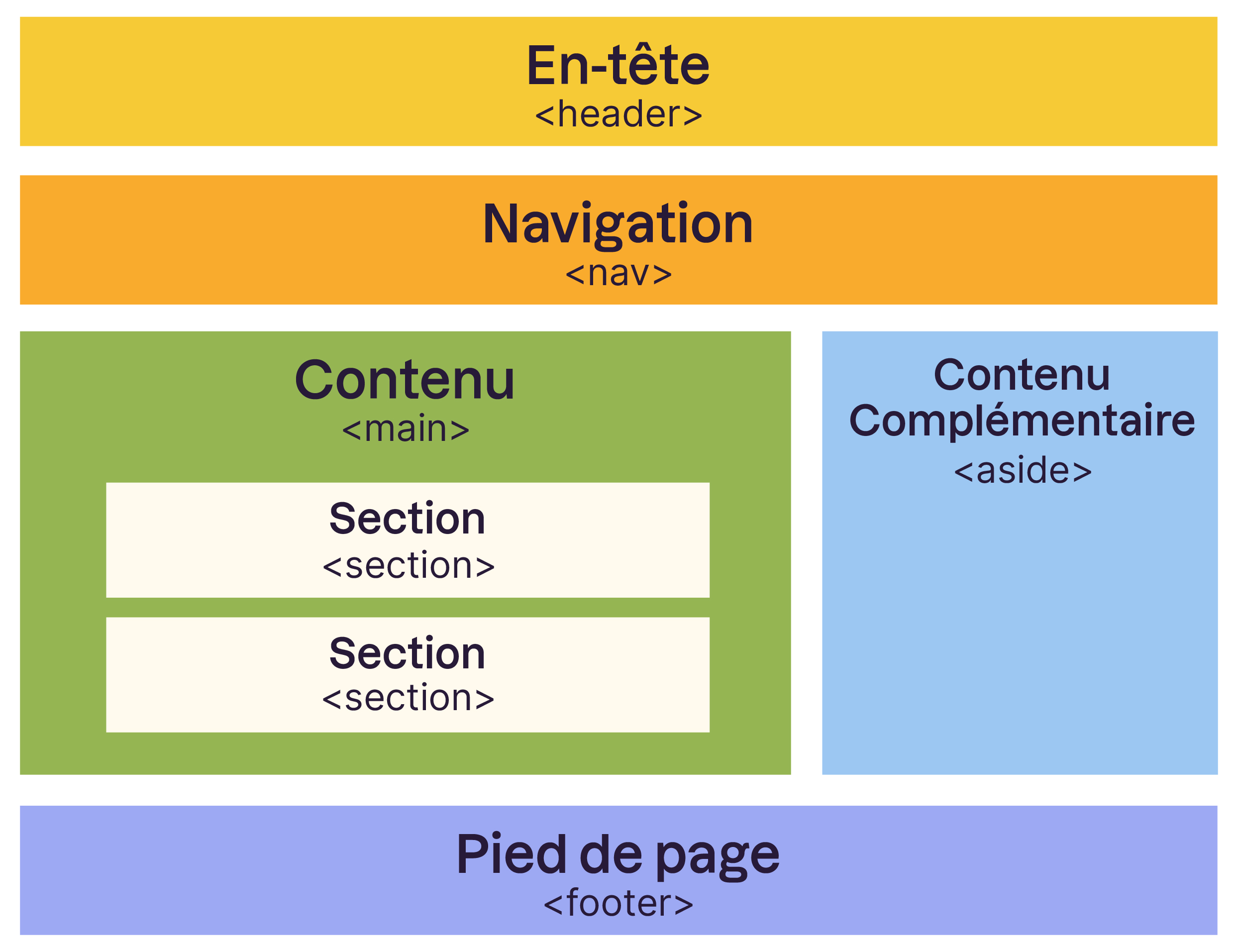 Les balises <header>, <nav>, <main>, <section>, <aside> et <footer> servent à spéficier la structure de votre page pour le navigateur et les robots qui parcourent le web !
